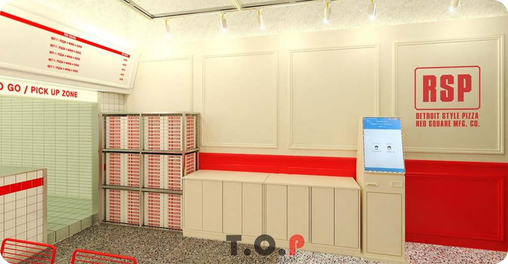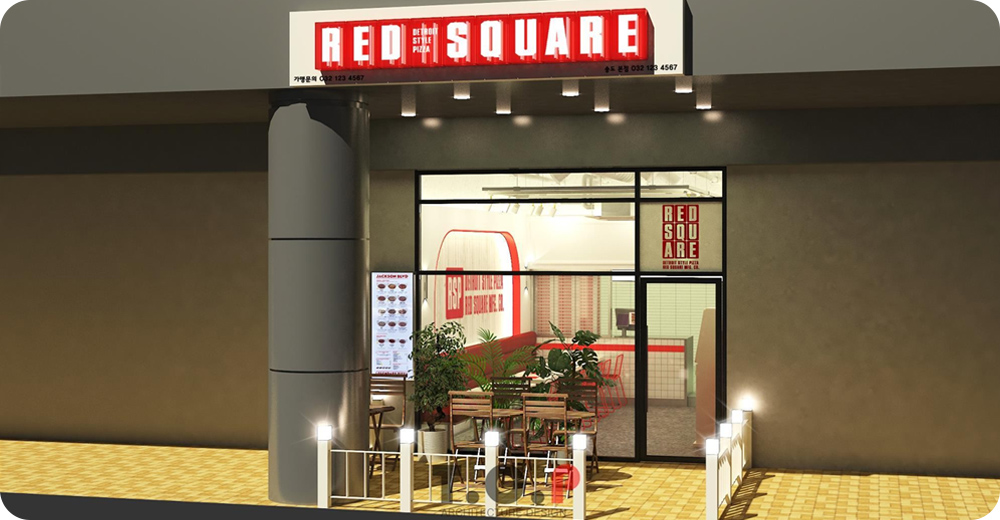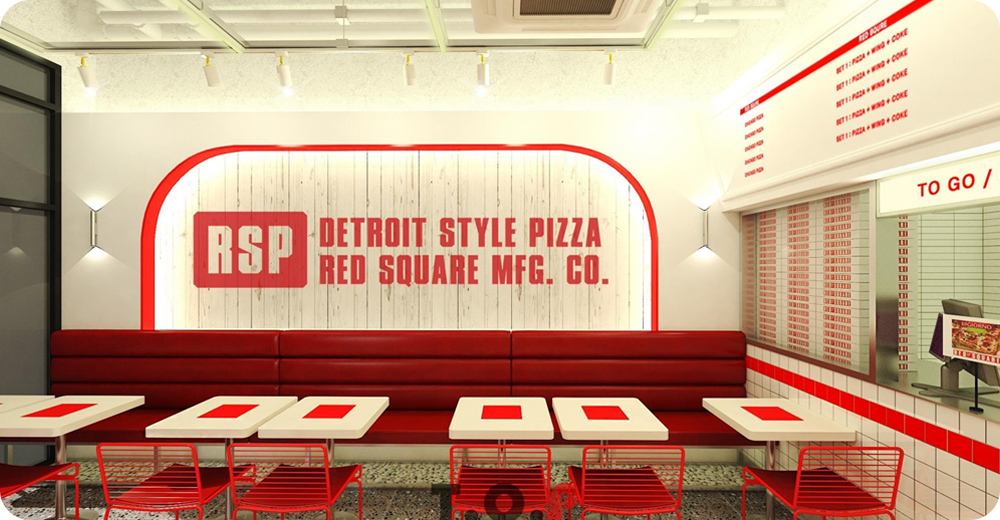 레드스퀘어 브랜드 강렬한 레드의 토마토 소스와 하얀 치즈 색감의 하모니를 이룬 정통 디트로이트 피자샵 컨셉